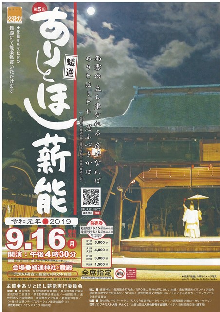 に行く。カミサンの同僚 から誘われたもので、ちょうど子供2人も帰ってくるのに重なったので、追加で2名のチケットも押さえ、でかけたもの。昔、院演習で日根野に行ったとき、立ち寄った。16時半開園。実行委員長についで、泉佐野市長のあいさつ(最後まで鑑賞していました)。世阿弥の確実な作に「蟻通」というのがあり、和歌山に赴こうとした紀貫之の話。狂言をはさんで、後半は「乱」というものでした。16時半だとまだ明るかったが、後半には暮れる。いちおう、ひととおりのセリフを文字にしたものの配られていた。そのまま聞いていても、半分はわからない。音は明瞭でも、言葉が古く、なかなかたどれませんね。でも、能というのも楽しめます。