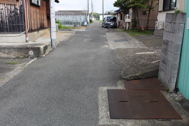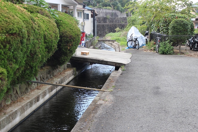 池水利組合というのは、 牛神池、七ツ池、大池、三ツ池という、4つの谷に設けられたため池による水利の総称とのこと。条里に沿う東西に集落まで一直線に通る水路が「大溝」とよばれる幹線である。写真下がそれ。