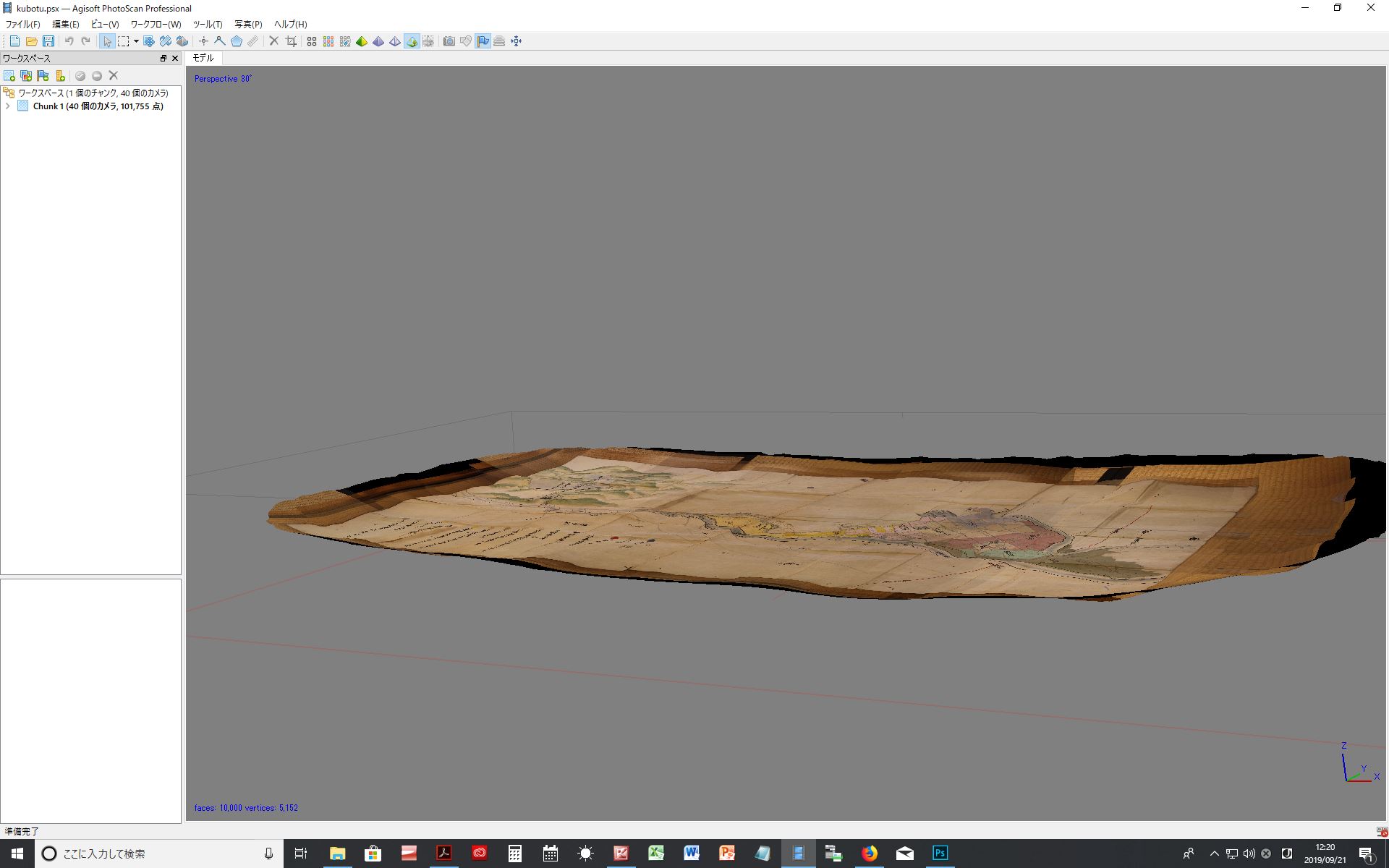 ◆なお、もっとも時間がかかるメッシュ作成は、現場のトレンチでも時間はかかるができていたが、これが何度やっても、かなりの時間を要し、メモリが足りませんと止まってしまう。なんなんでしょうか。点群データが多いのでしょうか。そこでメッシュの素材を低密度クラウドにするとあっという間にできた。部分拡大をするなら別だが、全体を示すこと、あるいは文字を読みに行くには十分である。