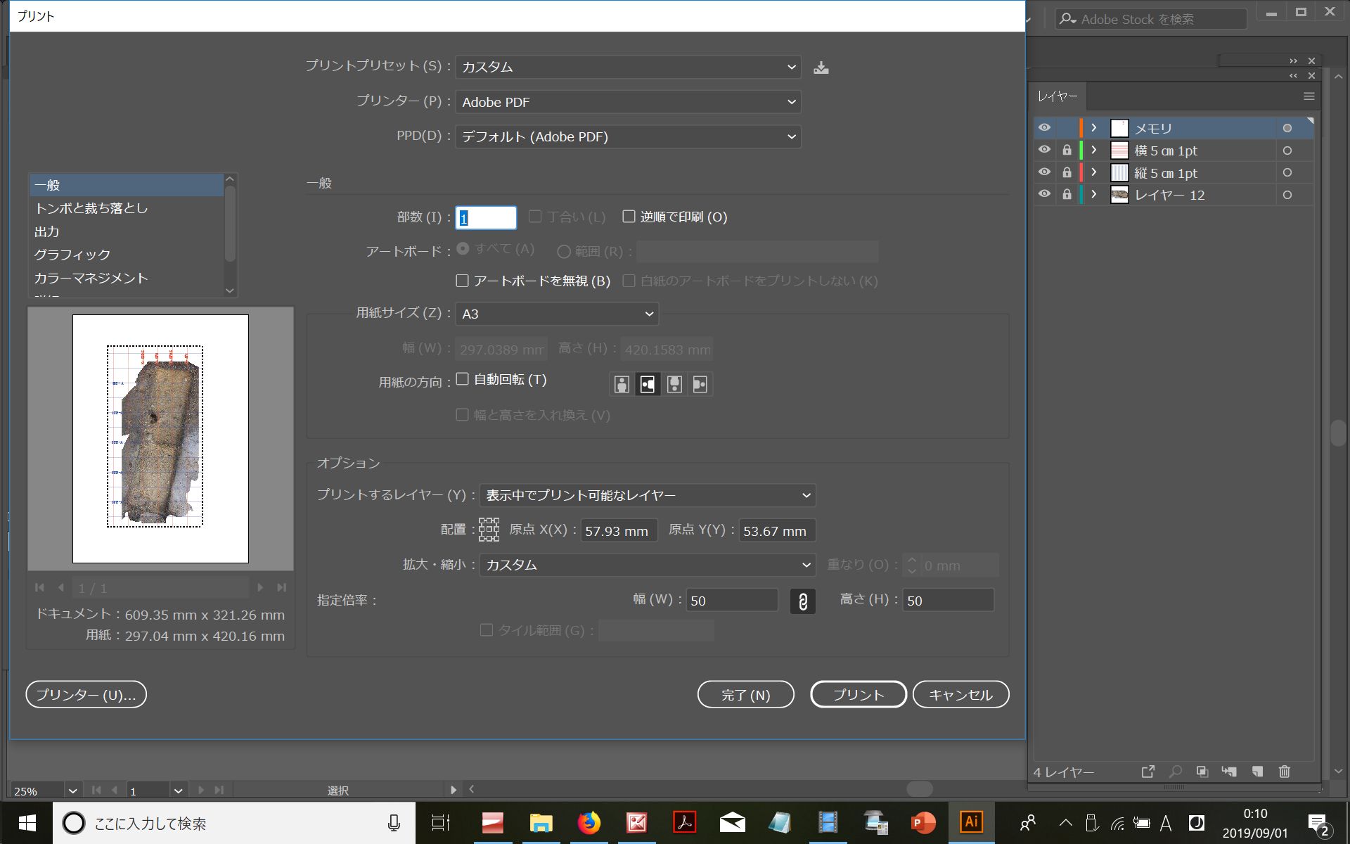 とえば、全体図20分の1は、10分の1 で作ったものから改めて20分の1を作ることはせず、PDFを作る時に、右の画像のように、A3、50%縮小にして、20分の1原図を出力します。埴輪や葺石の10分の1下図は、区切りを考えながらPDFの枠を決めています。