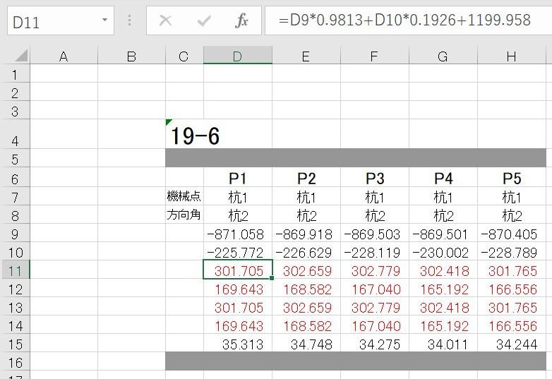 ◆で、この場合であれば、緑ラインの国土座標値を時計回りに11.1度でピンクの局地座標系、さらにトレンチ設定を加えた角度分を振り直さないといけない。その角度を計算し、サイン・コサインを出し、エクセルの演算のサイン・コサインの値を変えてやる(もしかしてエクセルでsin11.1、などでいけるのでしょうか)。いまは関数電卓をもっていなくても、スマホでやれる。