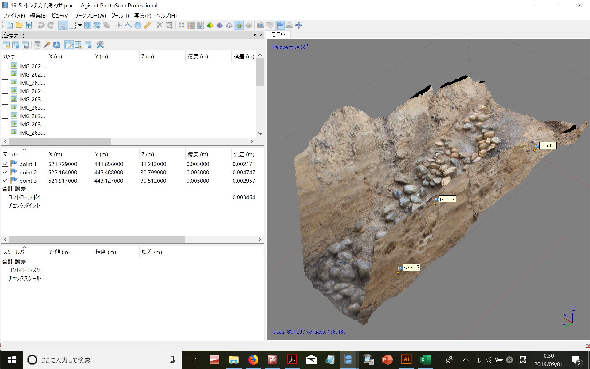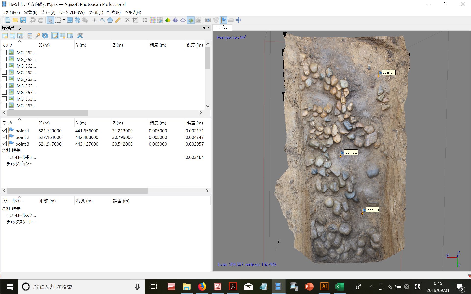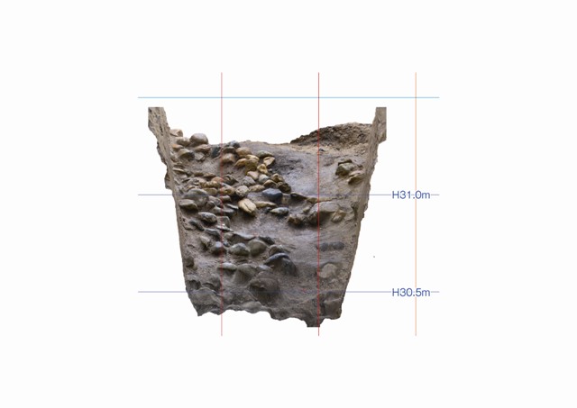 ◆注意すべきはマーカーとするポイントを打つとき、立面にした時でも見える位置に打つ必要がありますね(今回も、そこまで十分に配慮できていなかったが)。葺石のない地べたに打つわけだが、それが低いくぼみであったりすると、立面オルソでは隠れて見えなかったりするわけです。オルソができても、その縮尺をあわせ、高さを切っていくには、マーカーが見えないとできないので。