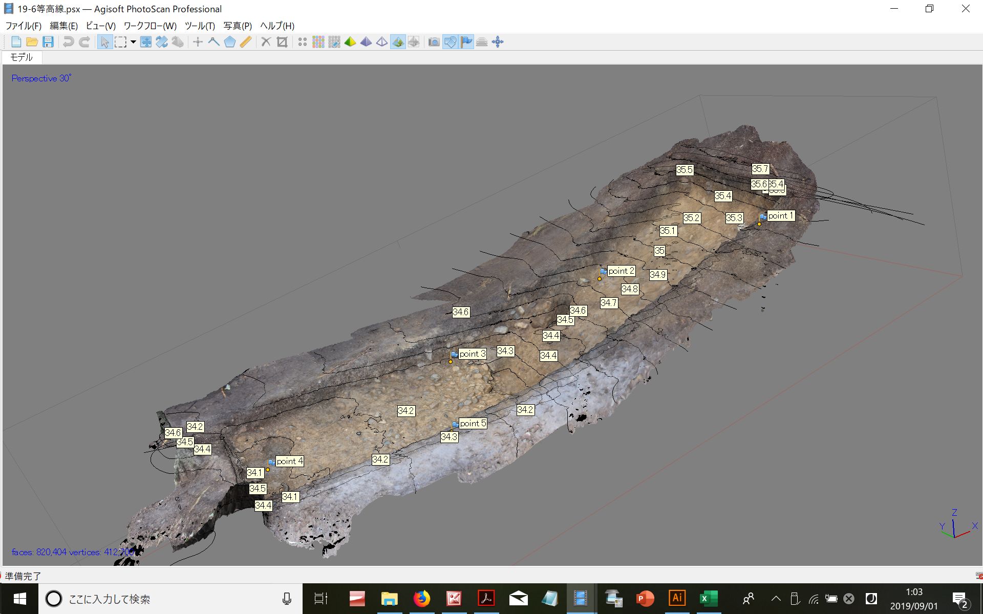 ◆DEMを作成すれば、ツールで等高線の作製。間隔は任意。10㎝にしてみます。みながフォトスキャンを使えるわけではないので、こういう画像をプリントスクリーンで採取し、担当に渡せば、各部位の高さはこれで記述できる。