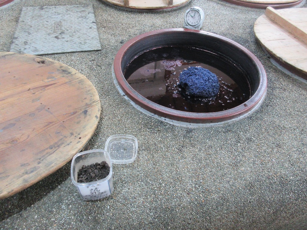と、いま「すくも」を作ることのできる技術者は10 人いないという話を聞く。そして「すくも」から染料にする作業をやっていた。藍の花というのを知る(桶のまんなかに浮かんでいるもの、じゃなく、膜として浮かんでくるものだそうです。いやまんなかのでヤッパリよいか)。
