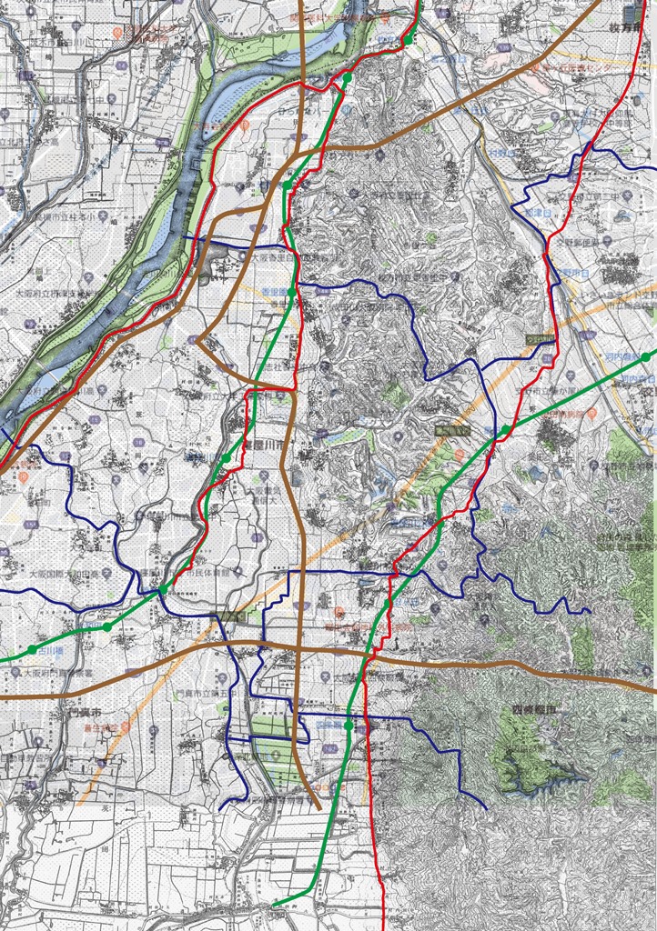 に突き出た先端が枚方宿。いまこの丘陵上は家だらけ。が、かつては交野郡と讃良郡を区切るものであった。赤は旧道、京街道・枚方街道・東高野街道。青はいまの行政界、門真、森口、四条畷、大東など。緑が鉄道(交野線は入れてませんが)。学研都市線と京阪で、駅の位置に丸をした。茶色が国道。1号線と171号線、それと清滝街道。第2京阪は太いのでわかりますよね。