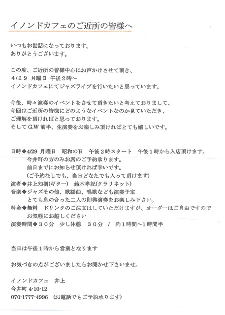 てしまいました。コーヒーを飲んでと。翌日はジャズライブだそうです。