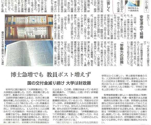 【追記】4月19日の教授会後、東洋史・西洋史の新任の先生の歓迎会。その席で、東洋史の先生が、新聞記事で取り上げられたこの人と、東北大学大学院生時代に、一緒に塾講のアルバイトなどもして、親しかったとのこと。で、この記事に対し、もう1人の人と、抗議文を出したのだそうです。その趣旨は、博士号が増産されたが職がない→先がなく自死、という取り上げ方が、ますます研究者をめざす院生を躊躇させるのではないか、ということのよう。