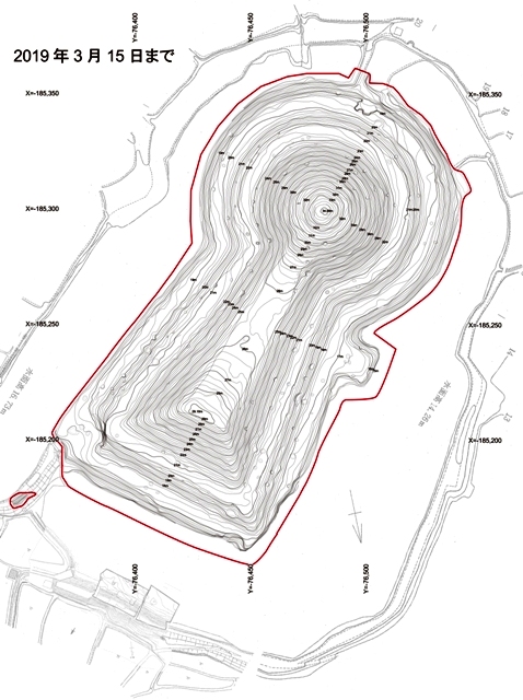 ◆朝7:30に出て、10時頃には着いたか。現地。後円部のトレンチから、くびれ部へ向かう。2018年 度は後円部トレンチの残りがすこぶるよく、それを仕上げることに集中し、写真のくびれ部トレンチは、2019年度に改めて行う。