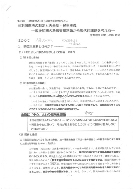 ◆講演はとても勉強になった。恒藤恭の思想にふれていた。そうなんだ、日本人じゃない、人間なんですよね。韓国人は、とか、アメリカ人は、といったナントカ人でなく、その手前で同じ人間なんだということ。個人がそれぞれ違うように、韓国のAさんとBさんも違う、アメリカ人のCさんとDさんも違う。考え方は、AさんとDさんと近かったりする。それをナントカ人とくくってしまうことの間違い。国籍が大事なのではない。恒藤の「世界民」とはそういうこと。望んでないのに、生れ落ちたら日本人だったという。それと、象徴とはいかなるものかということも学ぶ。この講演は京都府立大学の小林啓治氏。もう一度、レジュメを見ながら反芻するとよいのですが。