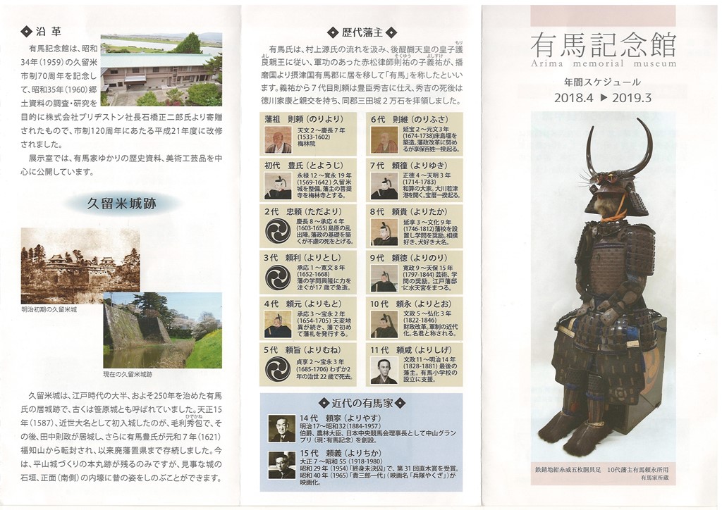を聞かせてくれました。お城 にも行ったそうです。有馬氏というのが17世紀前半に入部して幕末までいたそうです。記念館というのがあるらしく(ブリジストンが建設・寄付。大きな工場があるそうな)、その入館者用の配布リーフレットを見ると、播磨の赤松氏だそうな。それが有馬郡に入封され、三田城に入り、福知山城を経て、久留米にきたそうです。筑後川の川べりに城跡があるが、タクシーの運ちゃんも「何にもないで」と。で、実際、人は2人くらいだったとか。元に比べれば、本丸のまわりは変わってしまっているのかもしれません(スマホの画像で城跡を一応確かめました)。が、写真では立派な石垣と水掘も残っているところは残っている。