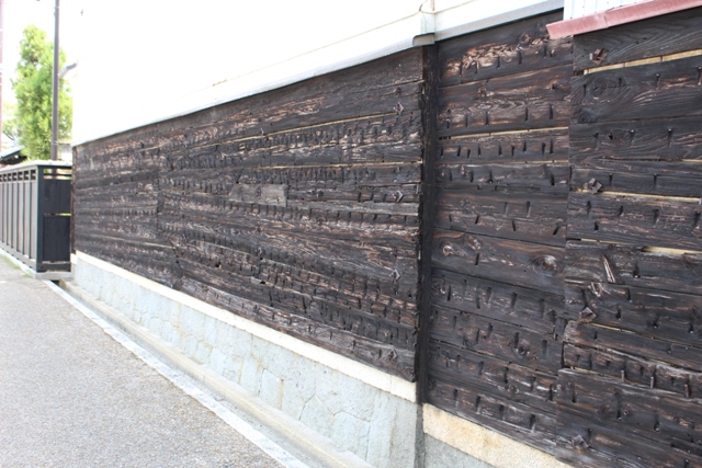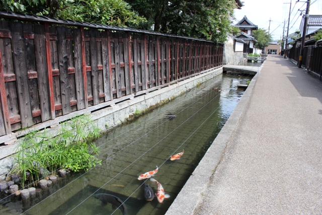 いて、魚が泳いでいる。それに接して建つ建物は、船板塀・白 壁造という。それを学ぶ前に、白い壁の下に、独特の規則的に掘り込みのある板が貼ってあるな~、と思っていたが、それは川船の廃材ということのようです。