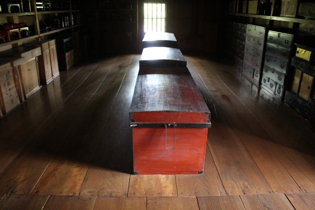◆写真は本家。土蔵のなかは、だいがい展示施設に改変されている場合が多いが、ここでは、もともとの様子を見ることができます。左サイドには、来客用などの塗りの膳や食器類が多数並べられ、右サイドには箪笥がな
