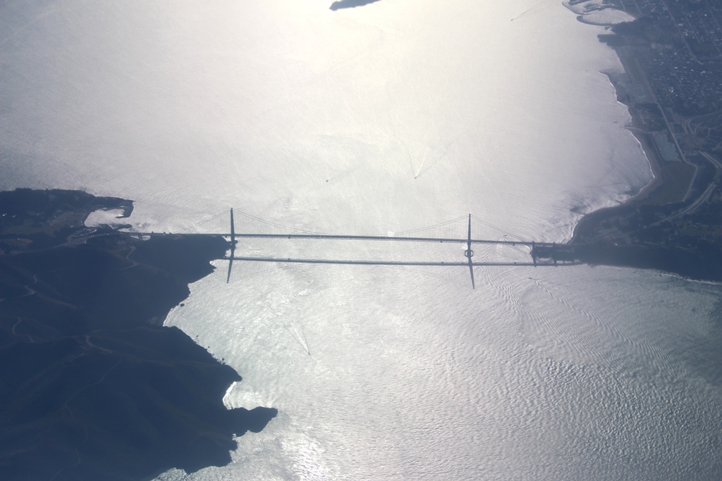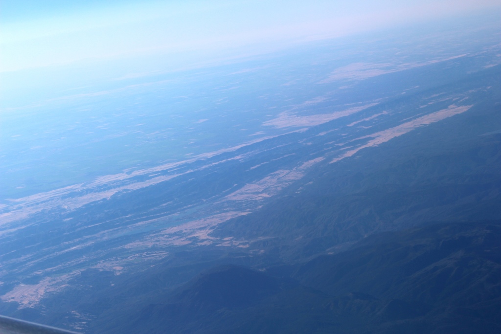 窓側、ホリーさんが間違ったんでしょうね。で、行きも帰りも替わってもらい、窓側を確保。サンアンドレアス断層と平行する縦の隆起の連続(写真)。大きな湖と思っていたら、GG橋だった。東から昇る朝日に、逆光だが、シルエットがくっきり。サンフランシスコの街。そこから入り込んだ海の南端まで行ってから、南から北上しSFOにランディング(8:35)。小さな飛行機で、降りてから、T字のコンクリートブロックをならべた通路にしたがって歩きました。