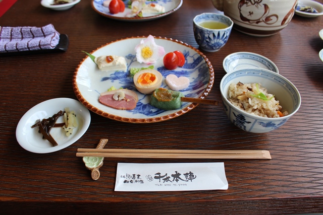 千本本陣。鳥取藩の参勤交代の時などに使ったもの。いまは飲食店になり、土日のみ営業しているよう。昼時で入ると、予約で座敷はいっぱいで、外のテーブル席ならと。写真は前菜、アマゴの焼いたもの、最後は蕎麦。2000円弱くらい。なかなかいいところです。家屋、庭もあり、維持がたいへんそうであるが、こうして飲食店をして残してくれている。簡単な看板があり、玄関のところには模型もあった。なんでも口コミで、飲食店の評判はよいらしい。