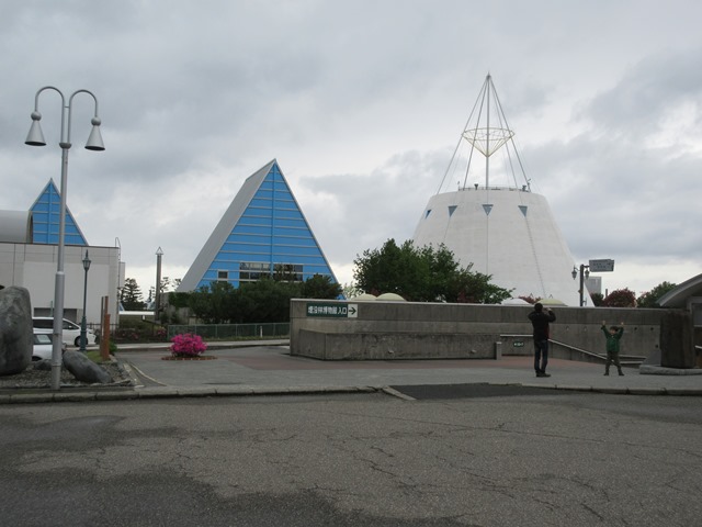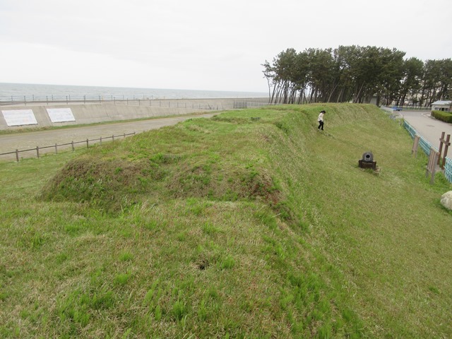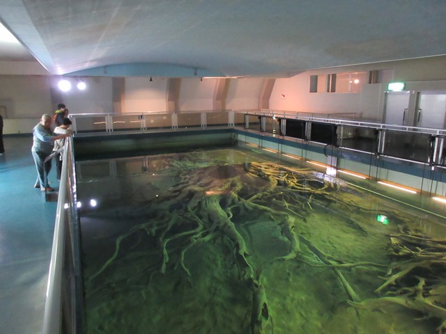 ◆いつのものなのか、なぜ海岸線より下にあるのかをめぐって、発見以来、何度かの 調査や年代測定の結果、徐々に理解に変更が加えられてきているようです。乾燥した空間での展示、水槽のなかでの展示(写真下)など、埋没林を示すための、いくつかの手法が取られているようです。天気が悪く、風がビュービュー。