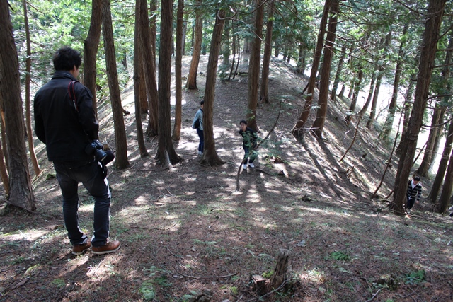 ◆調査の時には、いったいどこから上がっていたのやら・・・、そういうことがまったく「記憶にございません」。とにかくも、西側の谷が入っているいるところがもっともアプローチしやすいので、そこから取りつく。が、途中からは思いっきり急傾斜。が、上がっていくと、こんな急傾斜地のピークだが、尾根上にさらにこんもりとした前方後円墳のマウンドがある。