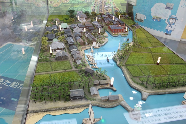 ◆銀の馬車道は日本遺産となり、江戸時代の飾磨港の模型が新たにできていました(写真)。1980年代頃のどなたかの絵、あるいは明治以来の古写真、これらの現在を示す企画展が行われていました(常設?)。軽いボードにL字金具で脚を付け、相互に連結した、手作り感満載の展示だったが、これがよい。軽いので自立してはいるが不安定、普通の展示では×なのでしょう。ボードの上辺と天井をワイヤーでつなげば十分でし