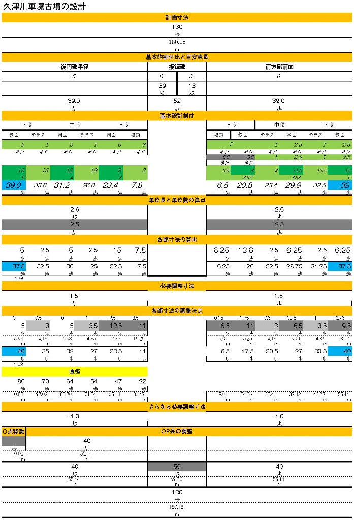 ◆こないだ網野でも、こういう表まではいかないが、墳丘長150歩。後円部径90歩に対し、網野銚子山は後円部が85歩で、後円部背面側で90歩の径より2.5歩短くなる。おそらく前方部の長さを2.5歩分縮め、墳丘長145歩にしている、といった見通しをえた。前に明石市でしゃべった時には、五色塚の場合は、後円部径90歩、前方部を10歩縮め、墳丘長140歩に仕上げていると理解できると判断した。陵山の設計をもとにしながら、個別で仕上がりが異なってくる具体相が、だんだんわかってきている。車塚の場合も、誉田御廟山の設計をもとにするが、300歩を130歩にしての各部寸法はその比率で出るわけだが、実際には後円部半径を39歩にすることはなく40歩としていると考えられるが、こうした複製の具体相を明らかにしたいものである。
