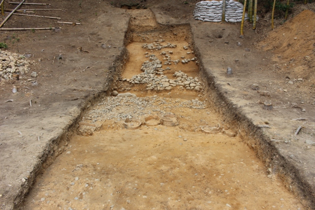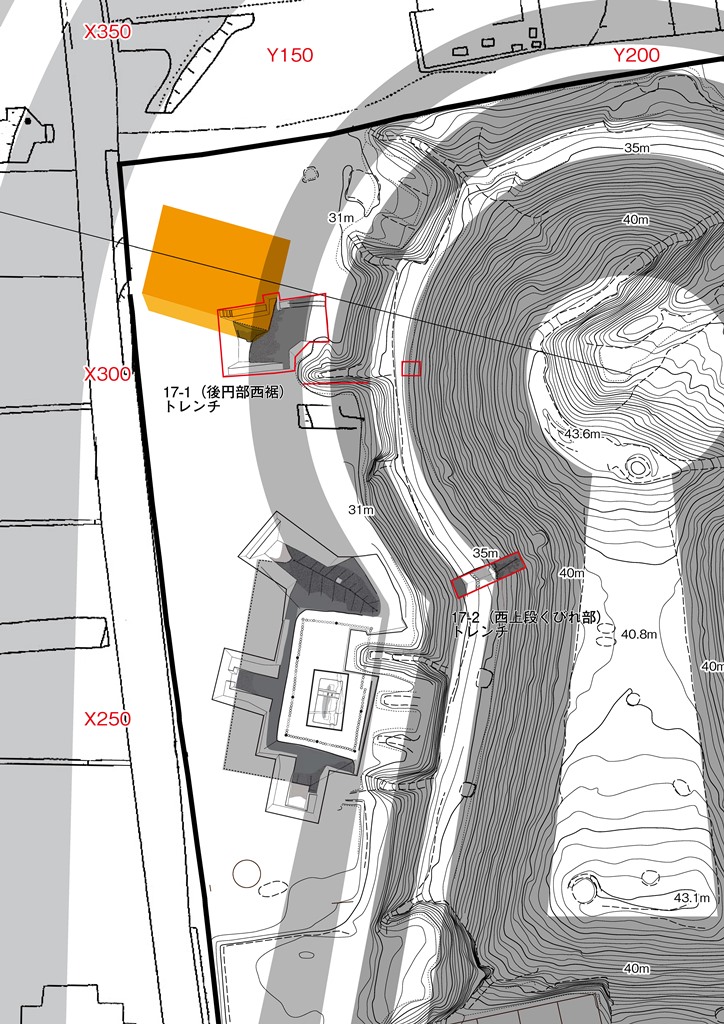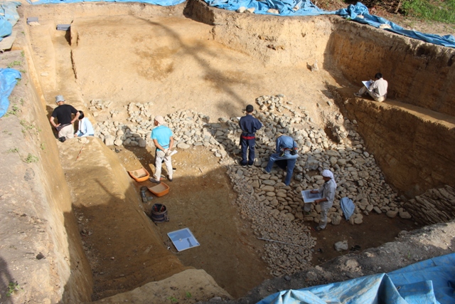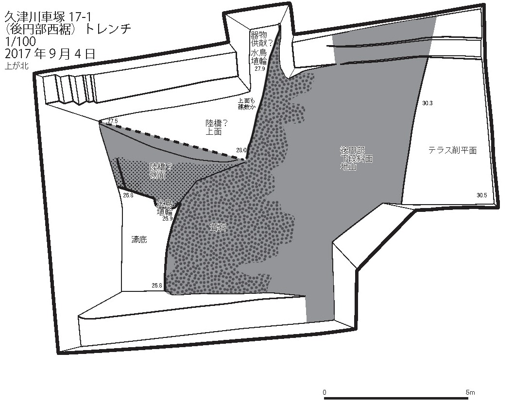 ◆17-1tr。葺石の平面図を進める。お昼までには平面図が一名を除いて終わり、午後からは後円部葺石の立面図と北壁の土層断面図を進める。天気次第だが葺石の平面図は明日の昼までには終わりそう。北壁の土層断面図は今週で終わると思われるが立面図は少々厳しい。弓と思しき木製品の横を長方形に小さく断ち割って残存状況を確認した。