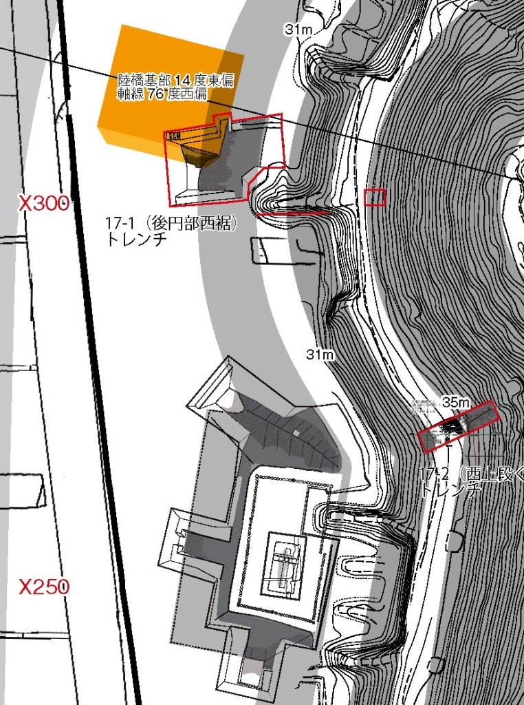 ◆2箇所の調査区図を仕上げましたが、それを入れ込んだ全体図。そうなんです、推定中心から放射線を引くと、こういうラインになる(気にはなっていた)。それからすると陸橋の幅はでかいと想像できる(以前に出した図でもこの線ありますよ)。