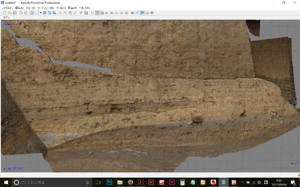 の3Dにならなかった(右)。できれば補い、壁面画像を残したい。前に記録としても有用ではないか、といったもの。失敗したらダメですけど。これ、マッチングした画像に標定点がひとつしかないので、座標を入れるうえでも失敗している。が、壁を削り線引きし、今日のような曇天で、きつい日光や影などない写真が撮れれば、正射影した正確な壁面画像が残せるわけです。