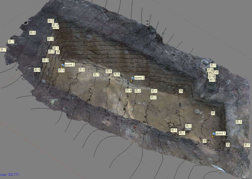 ◆18時、摂南大でマシンをまわし、上のトレンチもすっきりできた(右図→追記:マーカー1個の座標データ(標高)が少なからずおかしく(入力ミス)、この画像は修正されたが)。家に帰り、メッシュも切ってもらった。助かります!。