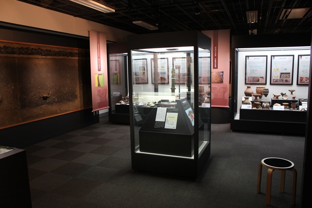 ◆博物館の内部については、もっとじっくりと復習しておく必要がある。いろんな資料もいただいたし、年間の予算などについても話を聞いた。考古の展示部分も立派ですね(写真下)。昆虫コレクションや、文京遺跡などの出土品をコアに、大学として力を入れているウリの研究紹介を組み合わせてある。そのなかのひとつが鉄でもある。