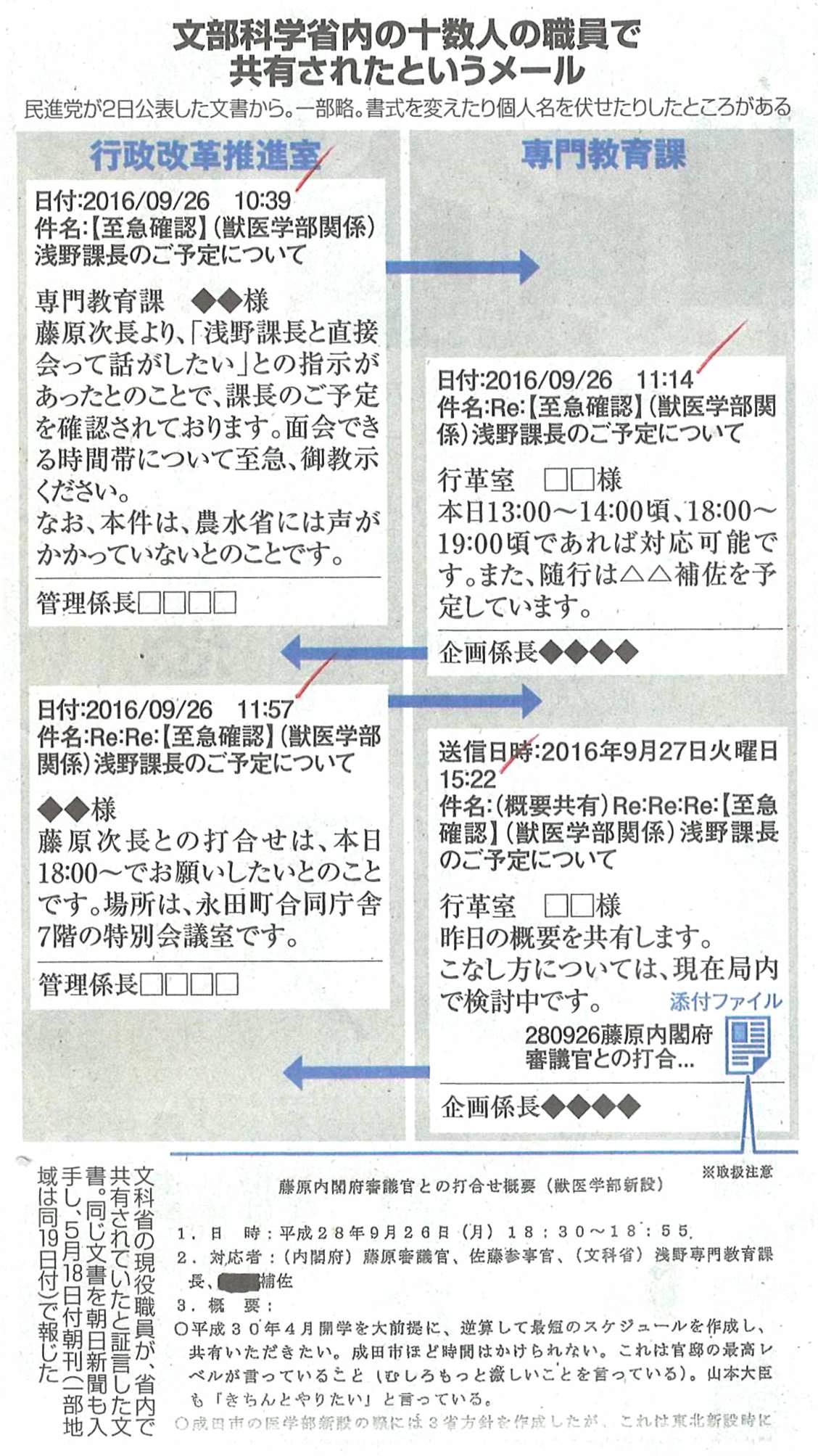 ◆カケ、だいぶ迫ってきました。メールのやりとりも流れ、添付ファイルを見た10人ほども特定され、記者は個別に当たり、最初は「答えられない」だったが、2日目には確かにまわっていた文書だとの証言も引き出された。そして今朝の新聞では、そのメールのやりとり、すなわち内閣府側から文科省関係課長と面会したいとの連絡があり、その調整がなされ、夕方に永田町の会議室で公表されているヤリトリがあり、翌日、そのメモがまとめられ関係者にまわされた脈絡も明らかになった。メールの本文、発信時間も掲載されている。いよいよシラを切り通せないところまで埋まってきている。