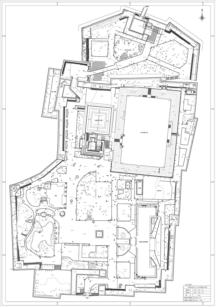 図を合体させた全体ができあがった。1/500。これまでも公園サイドが、公園管理のための平面図を何種類か作成しているが、重ねてみるとズレがあったりして、精度に不安を覚えていた。が、これで最新の高い精度の平面図ができ、今後、これが用いられて行くであろう。