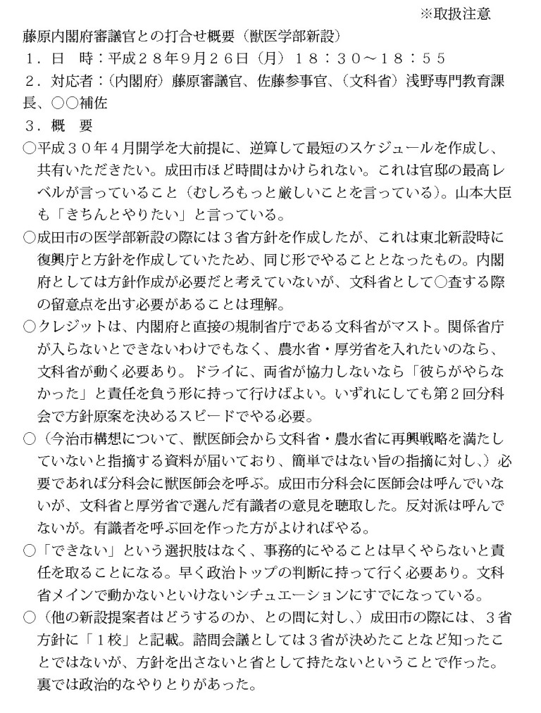 ◆安部総理は、今度の今治市の獣医学科新設案件について、2018年4月開学なので、逆算して最短のスケジュールでやれと言っている。山本大臣も首相の指示に対し、「きちんとやりたい」と合意済みだ。