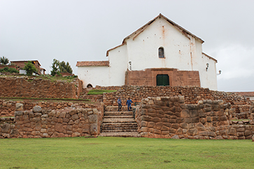 ◆どことも、インカ時代の遺跡は、スペイン時代に破壊され(その典型が都であったクスコ市街)、インカ時代の石垣は利用して新たに教会や建物を建てたりする。ここもそうで、坂道沿いに石垣があり、織物の店があり、そこを進んでいった遺跡中心部は教会となっている(上)。