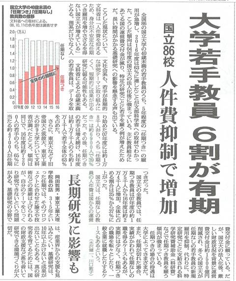 ひとつだけ新聞記事。ノーコメントにしよう。別件、女性研究者をいかに増やすかという話。そんな会があちこちで開かれているが、多くは成功者の話を聞くものという。むろん苦労して、研究者のポストについていて、どういう問題があるのか、よくわかっている人もいるだろう。が、おそらく概して少ない。いまそういう地位を得ている人は、まあ抜きんでている人で、環境的にもめぐまれ能力も高く、という場合がままあるわけです。そういう人を呼んできて話を聞いたところで、裾野を広げていく、という目的にはまったくあわないと。そりゃあんたはそうだったんでしょう、で終わり。むしろ、各分野で優秀と認められながら、ポストをえられず、非常勤をかけもちしている人、あきらめてしまった人、そういう人の話を聞くのが、どこに問題があり、どこを改善していかないといけないのか、ということを把握するには有効だろうと。それとその手前の問題。そもそも、なり手がない、研究者などめざさない、その現実を受け止める必要がある。それがいいか悪いかは簡単ではない。うちの文学部も2/3は女性です。優秀で、いい卒論を書く人は少なくない。が大学院に進学する人はまれです。