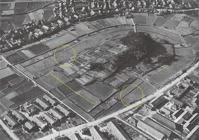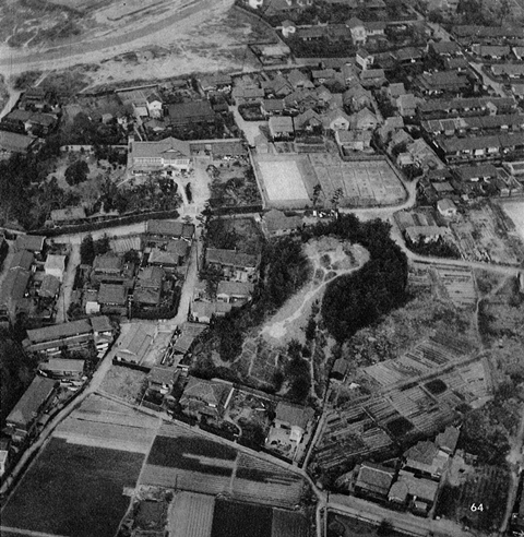 集』からということで挙がっている写真があり、こっちの写真の方が撮影は古い。この本、1980年刊行で、古本で2万~3万するんですね。で1957『空からみた古墳』をくっていると、『写真集』と同じ時期の別写真か、と思われるものがありました。東側面に張り付いている、畑地より古墳沿いの部分、これが平坦なのか斜面なのか、気になりますね。いまの入り口前にある道路をはさんで、向かいの緑地も。