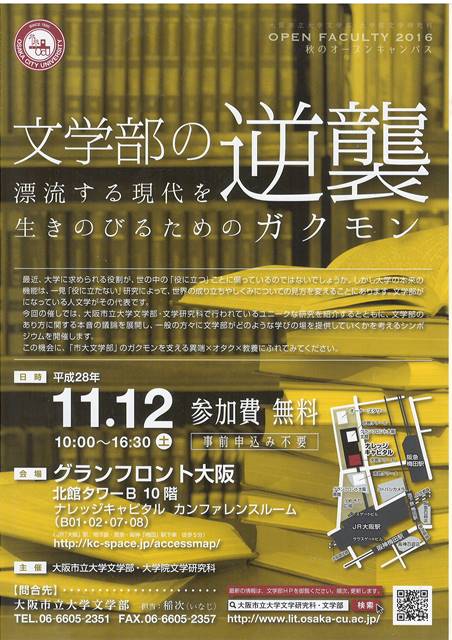 ◆ちょっと研究室の模様替えというか、あまりに増えていく物資、これらが雑然とそちこちに積みあがっているので、仕事に飽きたら片付けなどしています。で、こんなんが出てきました。市大・府大統合にかかわる文学部の会議に金曜日出たところですが、なにかの役に立つかもしれません。この会議、2時間の予定でしたが、博物館展示論の第1回があったため、半分で抜ける。まあ、なかなか発言しにくい。自分が抜ける時間も迫り、発言を求めて1回しゃべりましたが、なので後半戦がどうなったかはわかりません。11月に梅田でやるイベントのチラシも掲げておきます。
