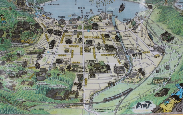 ◆宮津。いまはやっていない資料館の入っている「歴史の館」をのぞく。ここに掲示されている宮津のまちあるきマップがいいんですけど、そのあと駅の観光案内所でもらったマップは、より詳しいが単色のマップだった。近世城郭があり、城下町なんだが、核としての城がない。川筋のところに雰囲気を出す塀と、移建された門があるのみ。川の東側、小学校などになっており、川べりで解