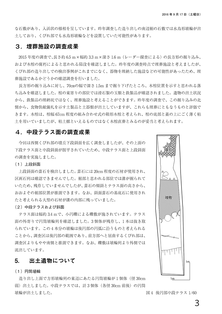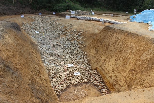 ◆記者レクはほぼ12時近くまで続き、その間、弁当を頼むのも忘れ、昼はラーメンを食べに行く。戻り、雨も落ち着いており、13時10分には作業にかかる。図面は3人、あとは墳端に下り、昨日の続きで、石を個々に検討し、全体のならびをながめつつ、最終の仕上げを進める。基底石はきれいにならぶわけではないが、およそのフレームが考えられ、その外側にも谷部南については葺石状に積み上げた重なりでがっちりの石がある。まずは後円部側について、角状の石を立てた2石があり、あんまり並ばないがずり落ちているような状況を配慮しつつ、一定の石敷帯があると理解し、外側を地山まで出す。緩やかに地山も上がってきて、残した石の下に入っていく。