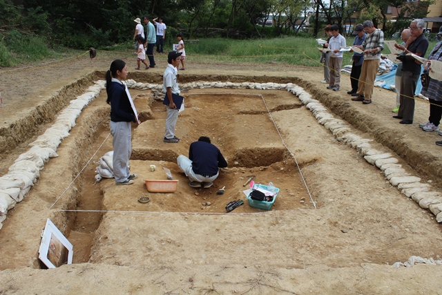 抗内の埴輪の取り上げがある。現地説明会のこの日、説明はしつつも、埴輪の掘り出し作業も進め、それも見せることに。とはいえ、なかなか進捗しなかったので、自分を含め3人で作業を本格化する。
