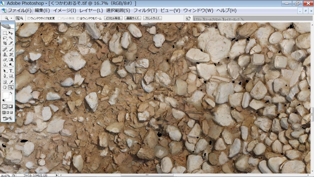 う(上右はその一部)。が、ティフで2.5ギガある。まあしかし、これにもとづき石を図化する原図としては十分に機能します(上左)。立面は立面でやや難がありそうだが。29日の週から図面にかかれるように、19日のレーザースキャンデータによる陰影図作成もお願いしたが、上半部は15日撮影のフォトスキャンによる下図も準備しよう。もっとも、19日に石をはずしたものもあり、変わったところが発生している難はあるが、それでもカラー画像の方が書きやすければ、書けるところはそれでやり、変化したところは陰影図に差し替えてもよい。