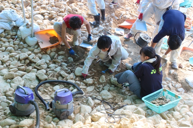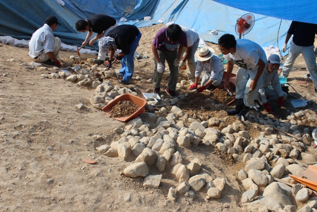 までたどりついたので、谷筋下半部で出てきた列石両サイドに人を配置する。長友さん、大澤は、木下とともに裾部沿いの石出し(扇風機倒れ、破損。おNEWとなる)。泉・森・水谷は上の目地だし。自分と安藤・田口で後円部斜面、道上・阿部で造り出し北斜面(写真1)。転落石との判断は慎重にとも思っていたが、谷筋列石でメドが立っており、その両 サイドでしっかりかみ合った葺石面が問題なく出てくる。転落石上面で止めていた両サイドの高まりも、浮き具合や埴輪の入り、葺石面が見えてくるとその面を参考に、あまり悩むことなくはずせる。
