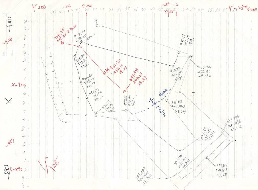 ◆最後に、大学に戻り、ノートにアラアラ落とした調査区図を、(座標値は控えてあるので)改めて1/50の略図に作成し、昨年の調査区と重ねてみた。5月8日に今年の調査区の案を示した。むろんそこでは、造り出しがどこまで北にのびるか、後円部径の推定復元径、誉田御廟山などを参考に、一応の推定をして、それが収まるように設定したわけです。が、今の南壁は当初案よりかなり北に位置していることが判明した。造り出し西北隅角は入っていない?。反省・・・。どうもならないが、大げさなことはできないものの、少しほじくることは考えなければならないだろう。いずいれにしても、今の調査区で北辺を確認するのが先決です。
