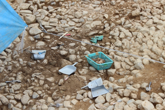 ◆というわけで、センター谷部では、囲形埴輪の位置にほぼ近づくところまで降りてきた。目地をほじほじし、大変な手間であるが、石が累々と積み重ねられ、ぎっちりと残っている姿が露呈されてきている(写真上)。