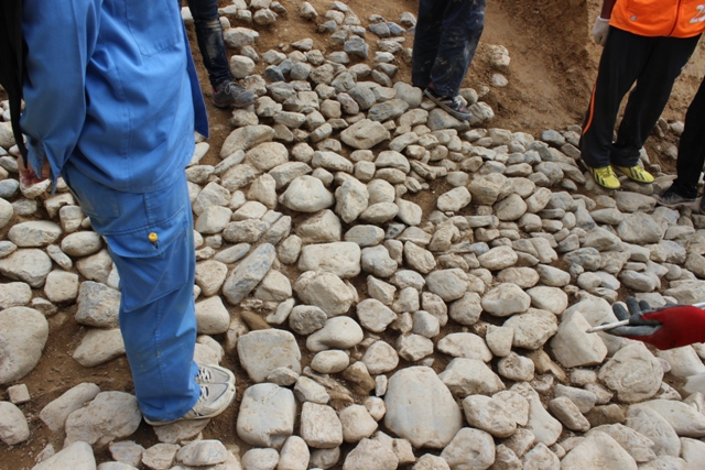 ◆昨日以来だが、続々と縦の列石が検出されている。列石は人頭大ほどで、間の葺石は拳大である。