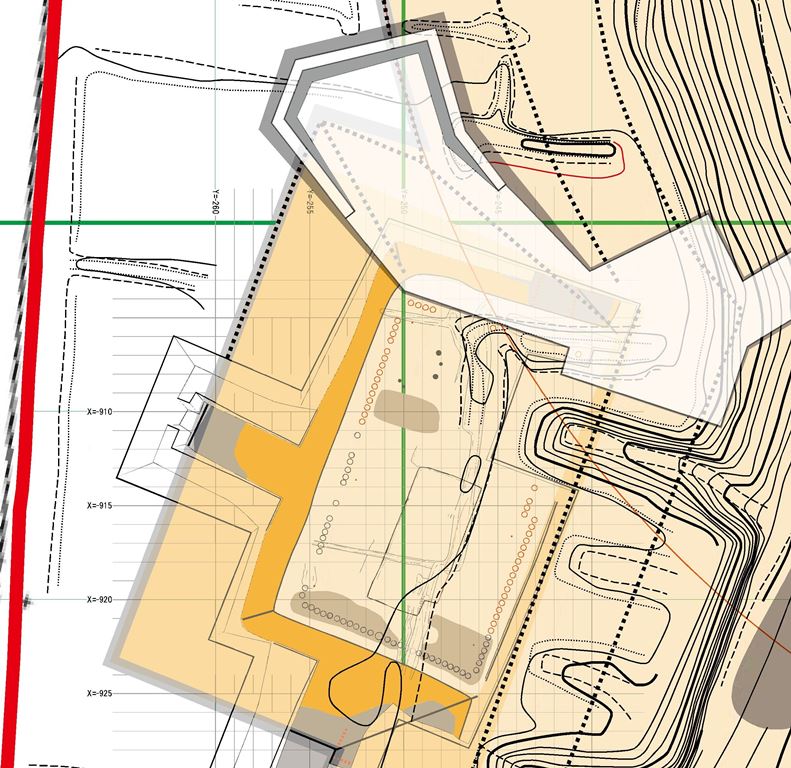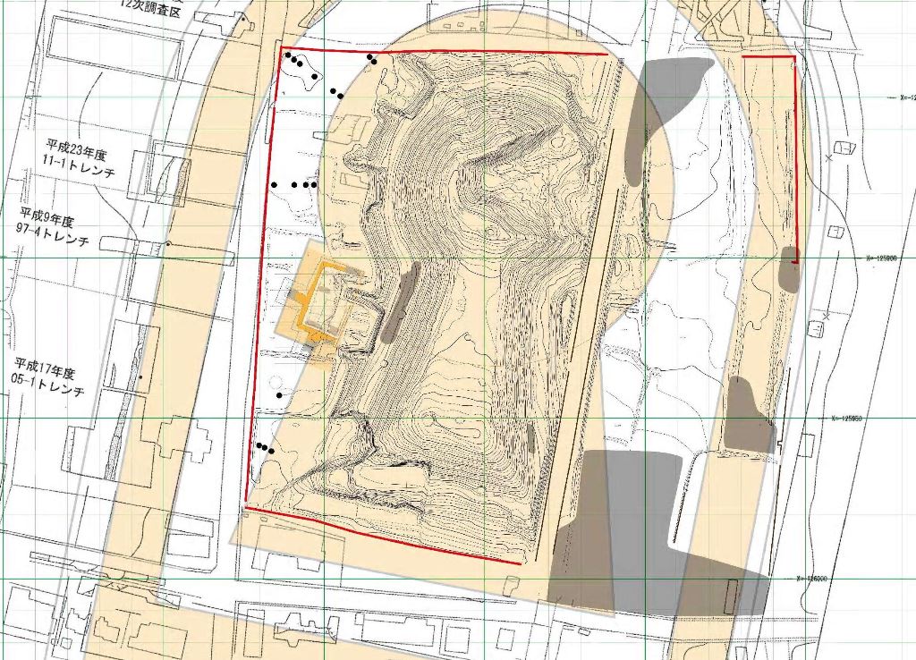 ◆それと今夏の調査区設定図。右端のトレンチは上段裾までと考えているが、やめとけ、という言葉も。中段斜面の葺石の残り具合によるだろう。設定はしておいて、中段から開けていく、ということで折り合いか・・・。