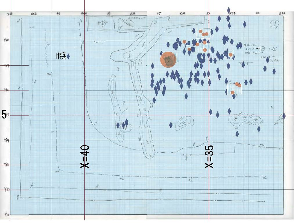 ◆2枚目は、完形土器(赤丸)と土器片(◆)をドットしたもの。造り出し北半部。南半部は2014年度にそうしていないし、2015年度も北半と同じように対応したわけではないが、現場では土器片をあまり見ていない。埴輪洗いをやっていくなかで、土器を抜き、それをアバウトにドットを加えていく必要がある。が、まあ