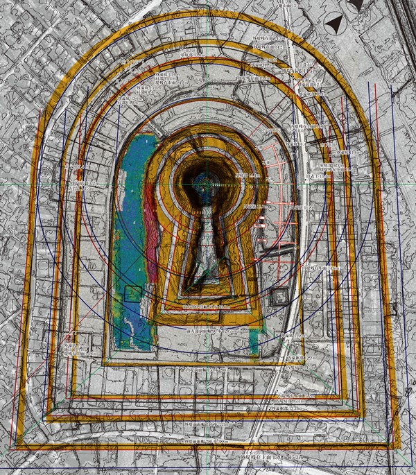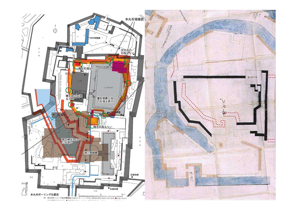 ◆豊臣大坂城の復元案は、なんとかさんが図化しているが、2年前だかに作成した500分の1本丸図に、改めて下層の豊臣大坂城を重ね、比較的浅い位置で石垣が捉えられるのではないかと思われるところを、埋設管も考慮して計画。右図は2012年6月の報告会の時に作ったパワポの1枚で、豊臣大坂城本丸は3段築成だが、その一番上の詰の丸の石垣を捉えるにはどこが候補になるか、考えたときのもの。