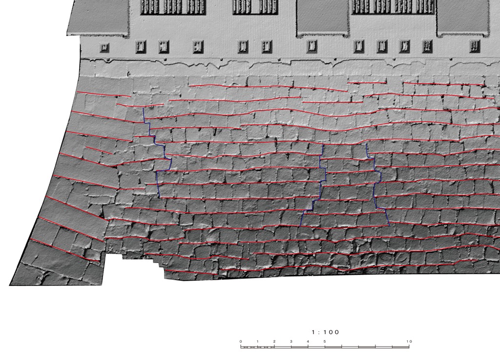 測量の組み合わせ、というのがいちばんいいかも。前に本丸500分の1作成業務を出したとき、地上レーザースキャンなわけだが、試しに天守台の1/100陰影図を作った。まあ、もひとつ前に刻印まで出るようなスキャンをやってもらった精度は出ないが、ひとまず石垣をとらえるには一定十分。それが右。やっぱり、こういう図があるからこそ、積み上げの書き込みとか、隅の処理の仕方とか、といった作業が可能となる。