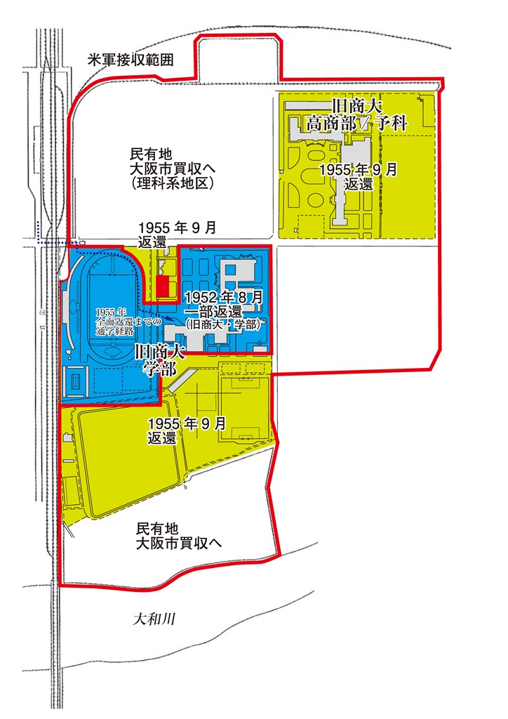◆で10年かかっているわけです、返還に。なので、どことも1949年に新制大学化し、戦後の教育を再出発する重要な時期に、市大は学部ごとに、市内の旧小学校などに分散していたわけです。難波宮の第1次発掘だってそうですね。大阪市美が基地だったんではないか。文学部の先生はいまの靭公園のとこだったか、違ったかな。