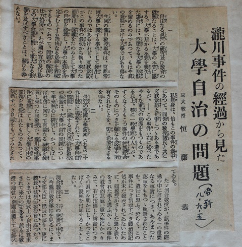 ◆で、1949年新制大阪市大になったとき、恒藤はそのまま学長になり、山根の難波宮調査も支援します。で、恒藤の資料は市大に寄贈されて、いま大学史にあるのです。その恒藤が滝川事件当時に書いた自分の文章や、いろんな新聞記事や人の論評を切り抜いて貼ったスクラップブックがあるのです。そこから1点。