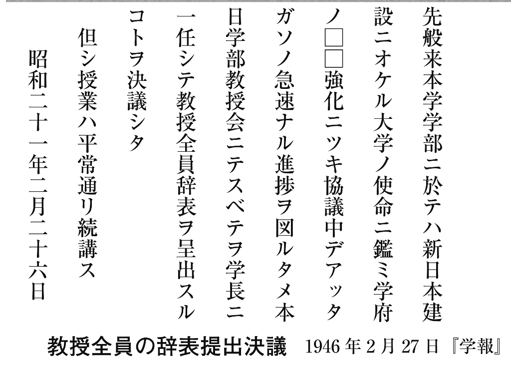 ◆そして特筆すべきことは、戦後、滝川事件の時のようなことが起こっているのです。これをパネルでは「商大の戦後処理」と呼びました。「大阪商大事件」で追われた教員の復職、その一方で、戦争に協力的だった教員の追放および辞職勧告です。それは学生1000人の集会でも決議されます。商大教授会は、恒藤に判断を一任し、全員が辞表を提出することになります。30数人いた学部の教授らは半分以下になります。その時の教授会決議がそのまま『学報』(大学の「官報」ですね)に掲載されている。