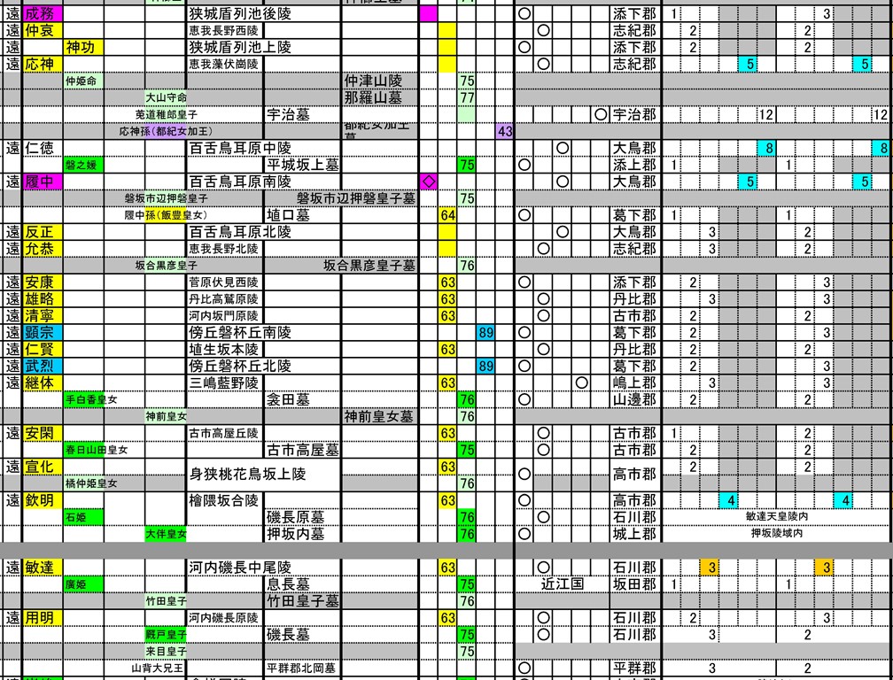 ◆舒明以前は、延喜式にあるのは基本は王墓で(列の白いヤツ。灰色の網は明治以降。)、そうでないのはそれなりに理由があると考える必要がある。このへんはレッカキョウの例会でしゃべったが。例えばイワノヒメ。これは多分に光明立后と関係があるだろう。ほかに古墳時代の皇后稜なんて延喜式にはない。で、兆域のなかで、牧野の15町なんてのは特別であって馬見丘陵を大きく取り込んでいるのだろう。5世紀代の陵墓なんて、だいたい順当に墳丘・周濠がカバーできる大きさになっているでしょ。そのなかででかいのが、仁徳であり、履中であり、応神。だから、持統朝には、つまり記紀段階では、仁徳陵は大仙に、履中陵はミサンザイに、応神陵は誉田御廟山にあてている。いまの治定は持統朝にそう決めたことに正しくたどりついている。が、それは事実ではないわけです。持統朝にいじっているから。なんでそういえるかは白石先生が解説済みなので、もうええ。だから文字資料からは辿り着けないんですよ。考古学です。